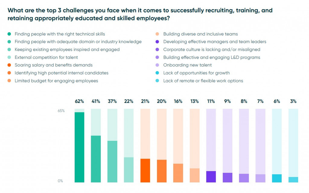 While 67% of our respondents said that closing the RPA and IA talent gap is a strategic priority, where does one start? For many organizations, the struggle begins in the first stages of the stage of the employee lifecycle, the talent acquisition process. When asked to select the top 3 tech talent-related challenges they were facing, at 62%, finding people with the right technical skills was by far the most popular choice. The second biggest challenge? Finding people with adequate domain or industry knowledge (41%).