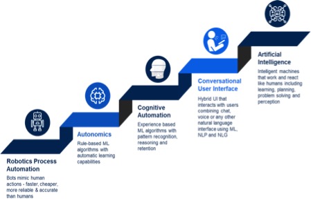 The automation journey, starts with the basic RPA. While some may call it dumb automation, the fact is that RPA does repetetive tasks faster and cheaper, be it for a technologist or a C-level decision maker. A smart and robust RPA implementation is a pre-requisite for a successful IA journey and once organizations have successfully implemented it over a period, they should then leverage the variety in ML algorithms, NLP and NLG to build cognitive automation and conversational user interfaces. The goal of this journey- and to become truly digital- should be to reach the true state of Artificial Intelligence- a state where intelligent machines work and react like humans start making efficient and quick decisions for your business.