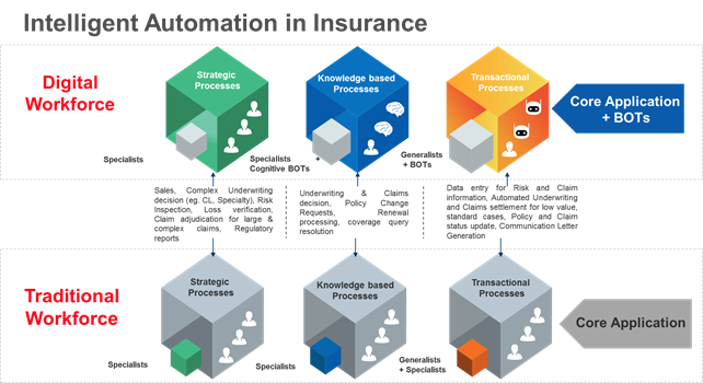 To gain maximum benefit of automation, Insurers are transforming from traditional human intensive workforce model to digital workforce - a combination of ‘People, Core Insurance Platforms and Robotics combined with Cognitive.’