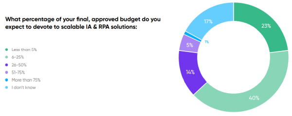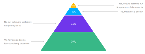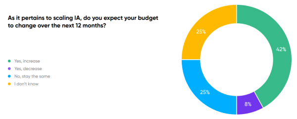 The silver lining is that, of those who have yet to fully scale IA, 85% say that achieving scalability is a priority for them, with 44% indicating that they have already begun this process. Plus, 43% of respondents expect their final, approved budgets for scalable IA solutions to increase over the next year.