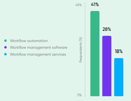 Given the critical role workflow automation plays in not only optimizing end-to-end business processes but scaling cutting-edge technology such as AI across the enterprise, it was no surprise that over 53% of respondents are already leveraging these tools. The fact that 55% of respondents expect their budgets for workflow management tools to increase over the next year and 41% anticipate investing in new, additional solutions strongly suggests that many organizations are already reaping tangible benefits. When it comes to sub-type, 48% of respondents are opting for simple, straight-forward workflow automation. However, as organizations look to automate end-to-end business processes and achieve hyper automation in the wake of the COVID-19 pandemic, we expect investments in workflow management and orchestration tools to increase.