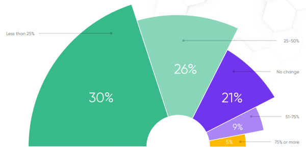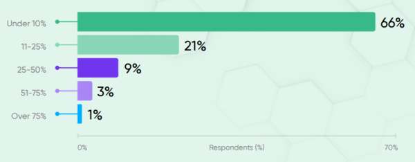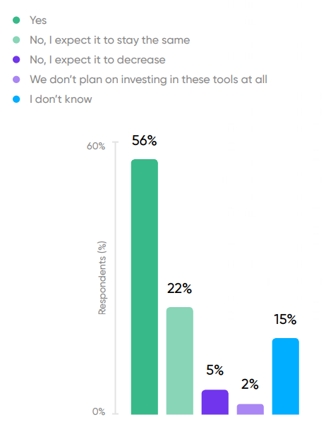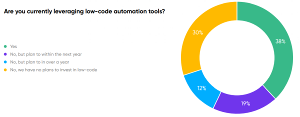 While 38% of respondents are currently leveraging low-code tools and 32% plan to eventually- a notable 30% have no plans to invest in low code at all. Though only 5% of those surveyed said their budgets are decreasing, it looks like, aside from those who are investing in LCA for the first time, budgets are somewhat stagnant.