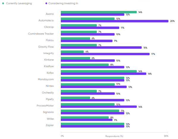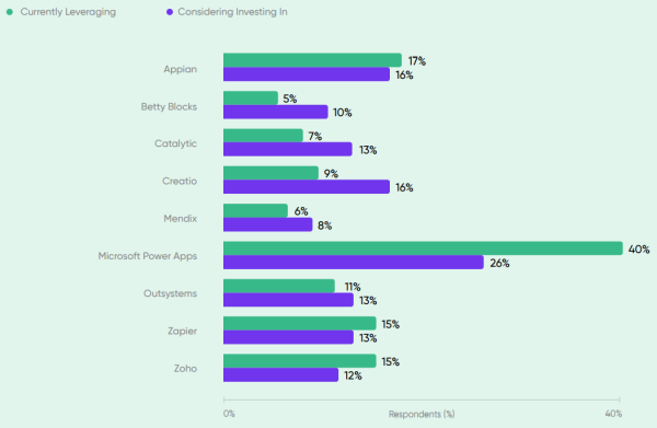 Similar to process discovery, it looks like organizations are leveraging multiple tools across multiple functions. In addition, while 40% of respondents are currently using Microsoft Power Apps, in terms of future investment, attention is much more evenly spread.