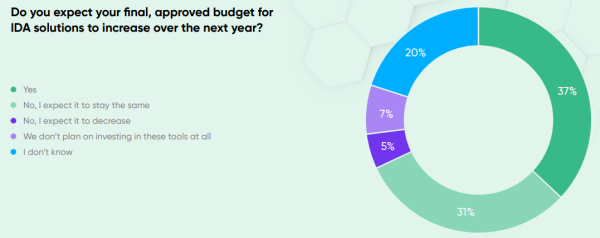 Though companies may have been on the slow side to adopt IDP, the tide is clearly turning. In addition to the anticipated 30% uptick in adoption over the next year, 36% of respondents also expect their budgets for IDA solutions to increase. We predict that the IDA market will continue to grow as organizations deepen their automation footprint and seek to cultivate more agile, distributed workforces.
