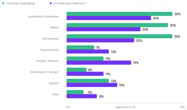 What seems to be holding many organizations back is a lack of a clear, enterprise-wide strategy for digital transformation and, ergo, global end-to-end enterprise automation. For example, many of our respondents seem to be juggling multiple, potentially overlapping solutions.