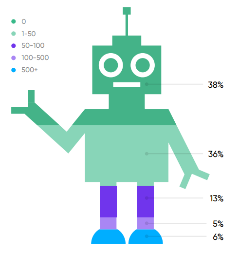 As for the data we collected, overall, 43% of those surveyed are currently leveraging RPA with 40% planning to invest in RPA over the next year. Of those who have already deployed RPA, well over half have only implemented 50 or fewer bots. This suggests that many of our respondents are still in the early, experimental phase of RPA implementation.