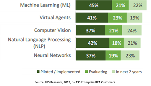 Enterprises have already implemented or evaluating in near term, a mix of automation techniques like Machine Learning (66%), Virtual Agents (64%) & NLP (60%). A 2 years horizon emerges for broad-based AI implementations across enterprise functions industry-specific processes (67%), customer service (65%), and supply chain (68%).