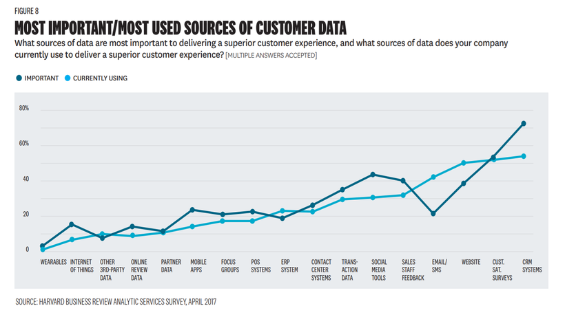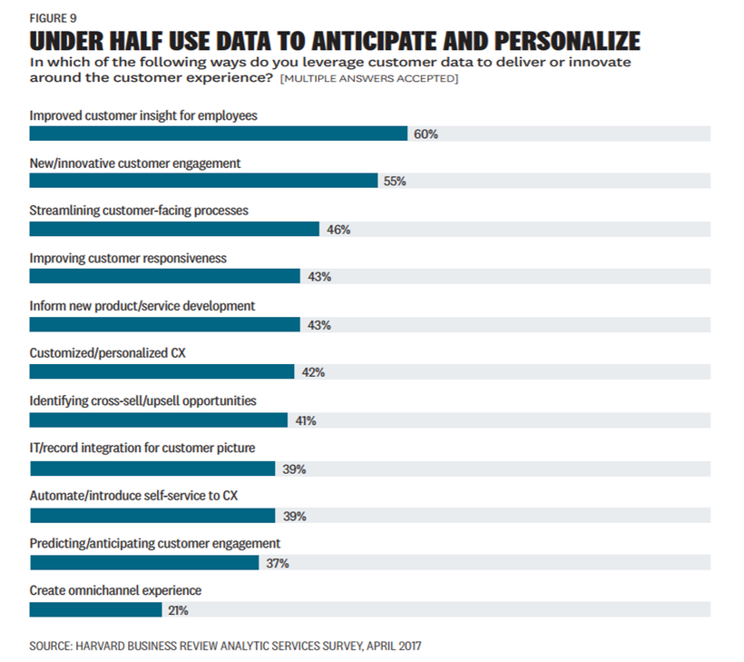 “Data has a clear role to play in developing a superior customer experience— and companies have access to more information on their customers than ever before. Indeed, they are seeing an exponential increase in customer-related data, driven largely by social media, mobile, and e-commerce. But these expanding troves of customer information alone are clearly not driving customer experience improvements—let alone innovation—in the vast majority of organizations.” — Harvard Business Review Analytic Services